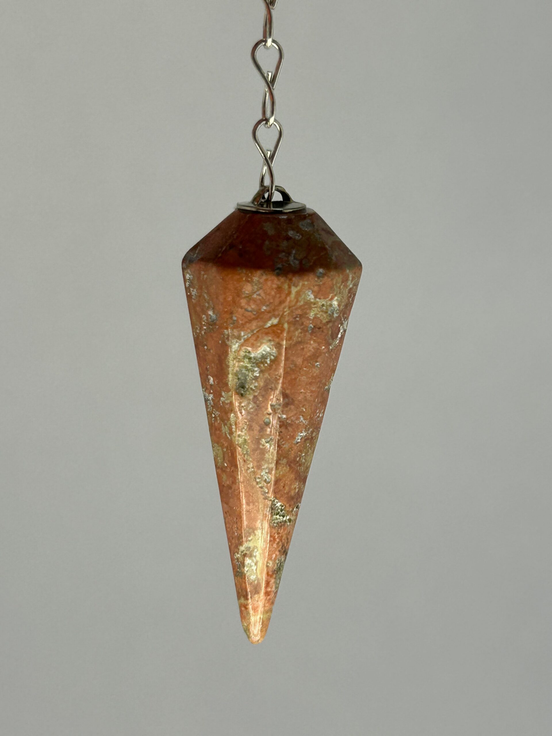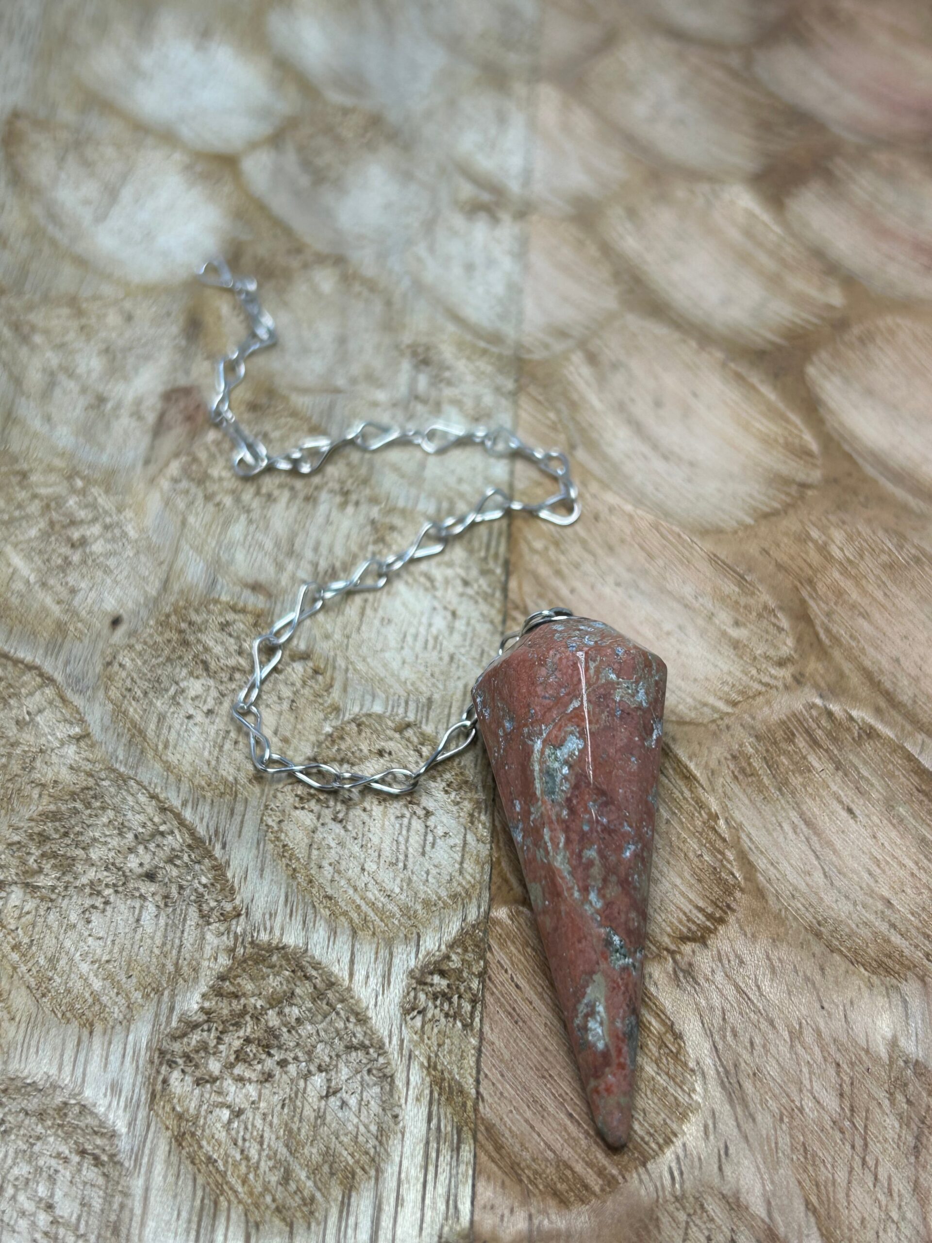 Ce pendule en pierre naturelle est monté sur une chaînette fine.